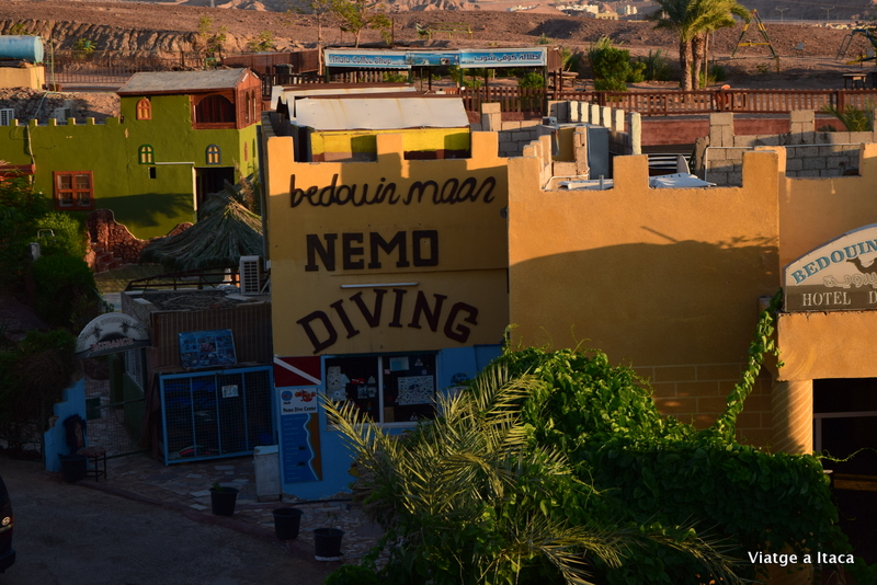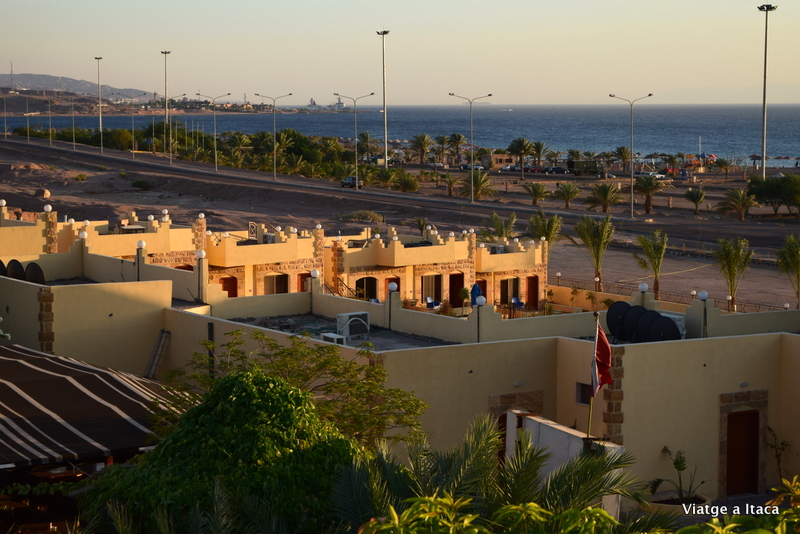 Ens costa trobar el nostre allotjament, està a les afores de la ciutat, en direcció a la frontera amb Arabia Saudí. Vorejant el mar, i ja preguntant-nos si el trobarem, de sobte apareix el Bedouin Garden Village, a l’altre banda de la carretera. Aparquem al costat, i només baixar, el sol ens recorda que segueix allà. L’aire condicionat ens havia fet oblidar-lo per una estona. Ja ens ho havien comentat alguns amics, però només trepitjar el nostre allotjament, creiem que l’hem encertat de ple. Tranquil·litat, piscina, a tocar de platja, i un noi molt simpàtic que ens rep i ens dona la benvinguda.